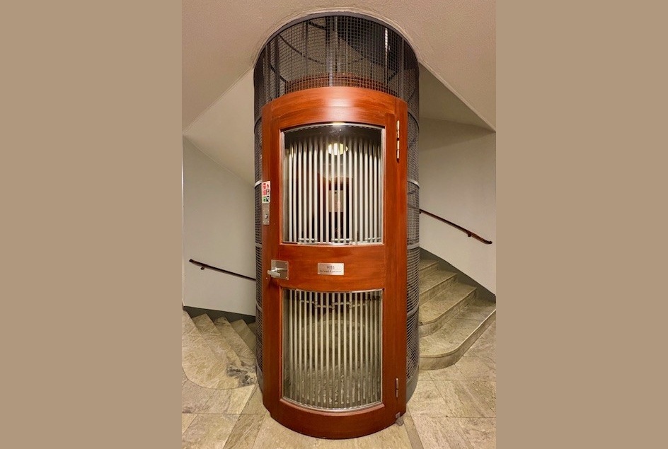 Med vår unika runda hiss framgår det tydligt att vårt hus är ritat av en arkitekt med omsorg om detaljer. Nu finns mer att läsa om vårt hus historia och om funkisarkitekten som ritat huset.